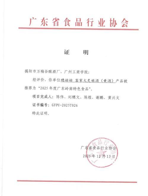 继2020年学校与校企合作单位兴宁市叶南渔村农产品开发有限公司共同研发的“众一口温泉漉菜”荣获“广东岭南特色食品”后,再次获此殊荣。此次荣誉是对“穗姑姑客家火炙娘酒(黄酒)” 产品品质的权威认可,也是广州工商学院长期以来坚持产教融合、校企合作办学方向的生动写照。近年来,学校聚焦粤港澳大湾区产业发展需求,不断深化产学研创协同育人机制,在特色食品、绿色饮品、乡村振兴等多个领域取得丰硕成果。未来,学校将继续以“德学・五进” 育人理念为引领,依托学科专业优势,持续探索校企合作新路径,推动更多科研成果转化落地,为地方传统产业转型升级与文化传承创新注入高校力量。
