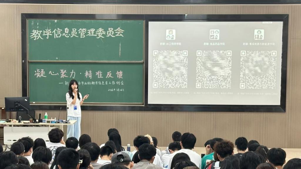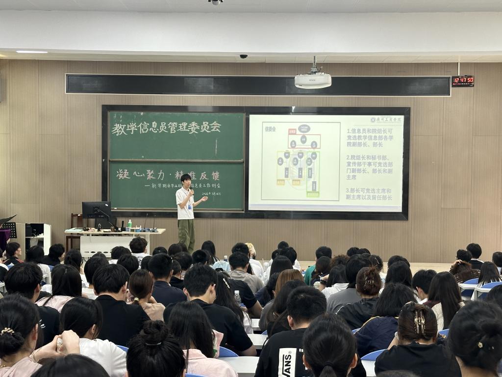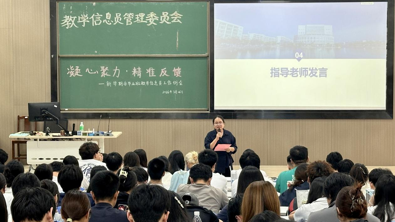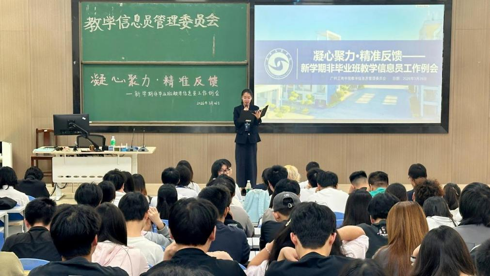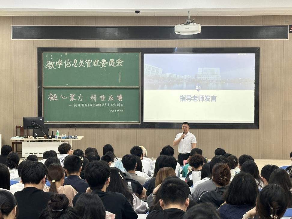 为进一步畅通教学信息反馈渠道,充分调动学生参与教学管理积极性,提高教学信息反馈质量,2026年3月26日中午,教务处在三水校区第二实验楼C204召开以“凝心聚力·精准反馈”为主题的非毕业班教学信息员工作例会。教务处廖自娜、黄荣林老师,校教学信息员委员会(以下简称“信委会”)学生干部31人,非毕业班教学信息员196人参加会议。
