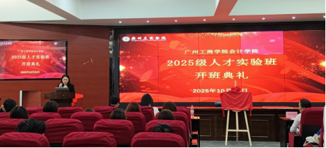 2025年10月24日下午,广州工商学院会计学院2025级数智财务卓越班开班典礼在办公楼322会议室隆重举行。金蝶广州分公司校企合作经理何锦漫女士、金蝶培训教育事业部资深顾问胡玉姣女士,会计学院院长任道纹教授、副院长全桂艳副教授、高少慧副教授,以及校内导师、辅导员、班主任和全体卓越班新生齐聚一堂,共同见证这一重要时刻,典礼由高少慧副院长主持。