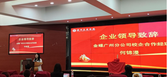 金蝶广州分公司校企合作经理何锦漫女士作为企业代表致辞,她向加入卓越班的同学表示热烈祝贺,并介绍了金蝶作为企业云服务提供商的技术实力与生态优势。她郑重承诺,金蝶将把企业真实应用的平台和案例植入教学,引入一线专家,共同开发紧贴前沿的课程体系,并提供宝贵的实习机会,目标是帮助同学们构建起“技术赋能、数据驱动决策”的核心能力,不仅成为优秀的财会专业人才,更是未来能驾驭智能技术、洞悉业务逻辑的企业管理者。她同时对学院的远见与支持表示感谢,期望双方在人才培养、科研创新等方面拓宽合作,共创价值。