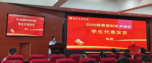 随后,学生代表陈彬同学上台发言,她的话语中充满了对未来的憧憬与扎实学习的决心。“我们深刻认识到,未来的会计人不仅是记账核算的能手,更是运用数据洞察业务、创造价值的先锋。”她分享了自己对数智财务的理解,并代表全体同学立下承诺:将从财务会计、成本会计等每一门基础课程扎扎实实学起,认真对待每一笔分录、每一张凭证,同时,将主动拥抱技术变革,积极学习数据分析等新技能。最后,引用“宝剑锋从磨砺出”与同学们共勉,坚信在学院与企业的共同培育下,定能成长为适应时代需求的复合型财会人才。