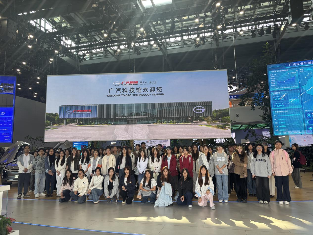 当天下午,同学们首先抵达位于广州南沙的广汽科技展览馆。在销售部工作人员的引导下,大家依次参观了产品展示中心、材料专栏及智能网联技术展示区(涵盖MARVEL系列、GAMES交互平台及SERVICES服务体系)。展区内陈列的“专业选定的八大面板”及品牌设计实物,生动展现了广汽在材料创新、造型设计与用户体验方面的最新成果。同学们通过现场操作与讲解,深入了解了品牌标识系统与优质服务标准的落地实践,切身感受到科技赋能汽车产业的真实场景。