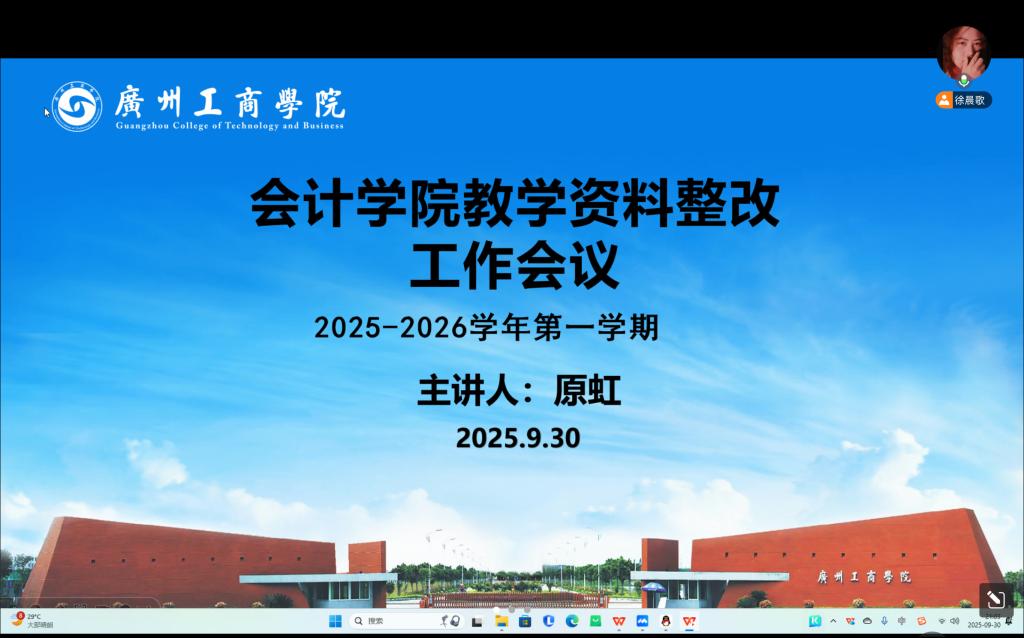 为全面落实学校督导组听课评课意见,切实提升课堂教学质量,广州工商学院会计学院通过腾讯会议召开教学督导反馈与整改专题会议。会议由各教研室组织,会计学教研室副主任徐晨歌主持,会计学院院长任道纹、会计学、审计学、财务管理的专业建设负责人(黄璐、原虹、宋娜)、教研室副主任及全体课程组组长参会。为兼顾教师们日间、晚间课程教学安排,确保全员参会,会议时间安排在9月30日20:30至22:30。