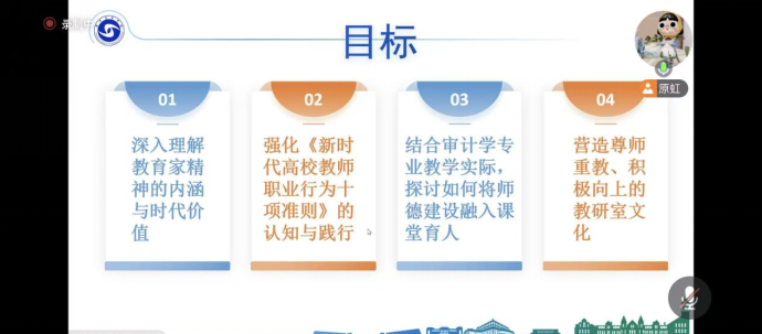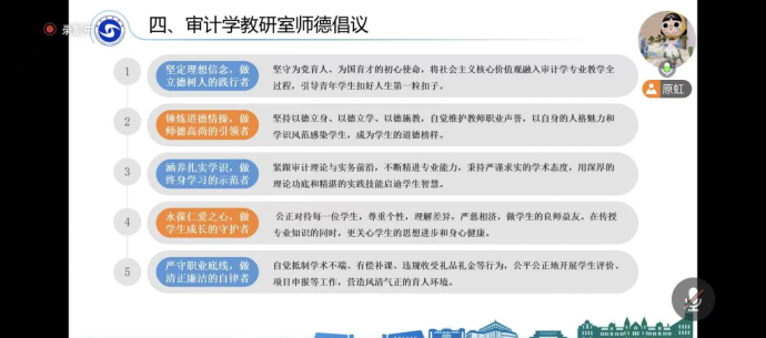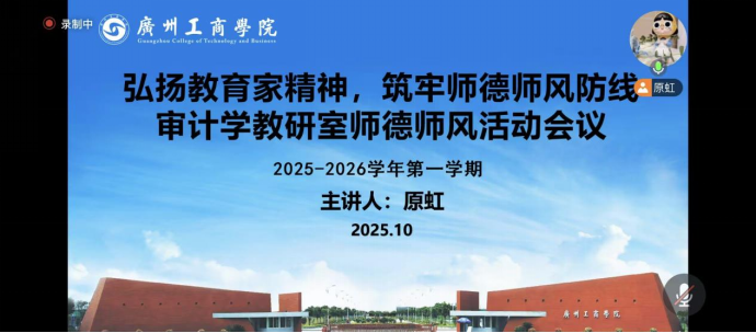 为深入学习贯彻习近平总书记关于教育的重要论述,全面落实《新时代高校教师职业行为十项准则》,进一步加强师德师风建设,提升教师队伍的思想政治素质和职业道德水平,2025年10月20日,审计学教研室通过腾讯会议召开了以“弘扬教育家精神,筑牢师德师风防线”为主题的师德师风建设专题会议。会议由审计学教研室主任原虹老师主持,审计学教研室全体教师参加。
