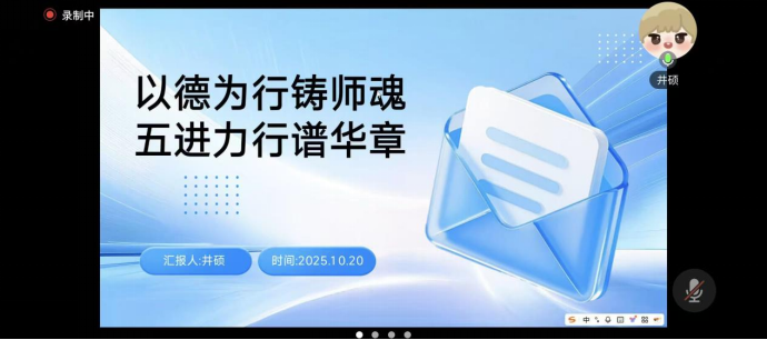 井硕老师以《以德为行铸师魂,五进力行谱华章》为题,系统介绍了学校“德学五进”育人体系的理念源起与实践路径。她重点分享了三维评价体系如何将师德师风量化为可测指标,以及青蓝结对工程在传承育人初心方面发挥的积极作用,展现了“五进”实践在落实教育家精神、培养高素质应用型人才方面的显著成效。