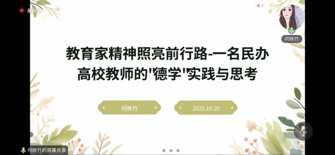 何昳竹老师则以《教育家精神照亮前行路——一名民办高校教师的“德学”实践与思考》为题,从教育家精神的历史传承与时代内涵出发,阐述了新时代教师肩负的使命。她结合广州工商学院“德学引领、五进育人”特色模式,分享了在《会计职业道德》《会计英语》等课程中融入思政元素、引导学生增强文化自信与社会责任感的做法。她指出,教师应做到“德学并重”,在传授专业知识的同时,注重价值观的塑造与精神的引领,真正实现“启智润心、甘于奉献、胸怀天下”。