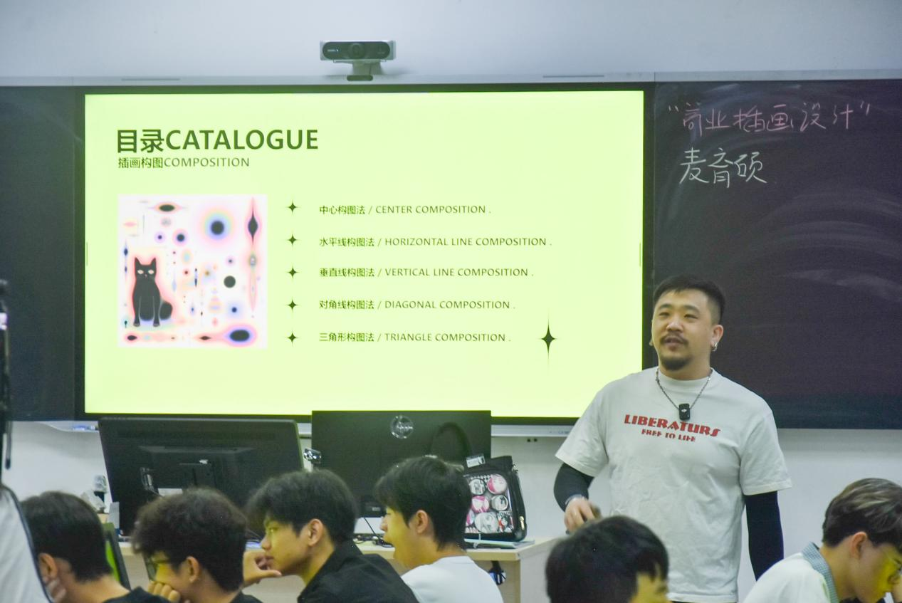 本次磨课活动以“聚焦课堂实战,锤炼教学基本功”为核心。麦育硕老师本次授课的课程为《商业插画设计》,主要讲解内容为商业插画的十种形式。课堂上,麦老师通过精心设计的课件,系统性地梳理了从对称构图到散点构图等十种经典构图法则,理论体系清晰,逻辑层层递进。在理论讲解之外,麦老师更辅以大量来自互联网、品牌设计等前沿领域的商业插画案例,通过生动的对比分析和启发式提问,引导学生深入思考不同构图形式所带来的视觉心理效应与商业应用价值,充分展现了其扎实的专业功底与课程内容设计的巧思。