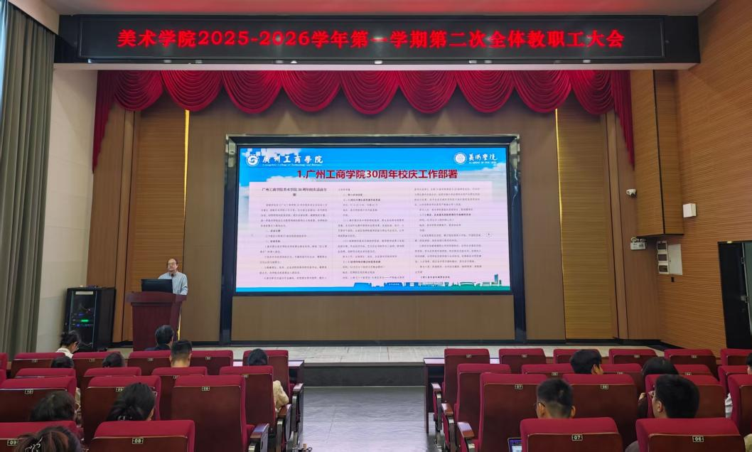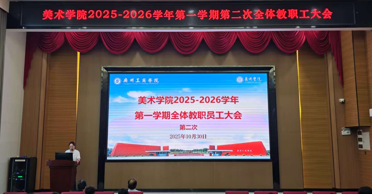 10月30日下午,广州工商学院美术学院2025-2026学年第一学期第二次全体教职工大会在图书馆415报告厅隆重举行。出席本次会议的有学院院长徐浩艇、副院长郝孝华及副院长王伟江,以及各教研室专任教师、辅导员和行政人员。会议由学院办公室主任程敏主持,紧密围绕“迎三十周年校庆、铸德学五进之魂”的主题,全面部署了下一阶段的教学、科研及学生工作的重点任务,取得了丰硕成果,充分展现了学院育人的新成效。