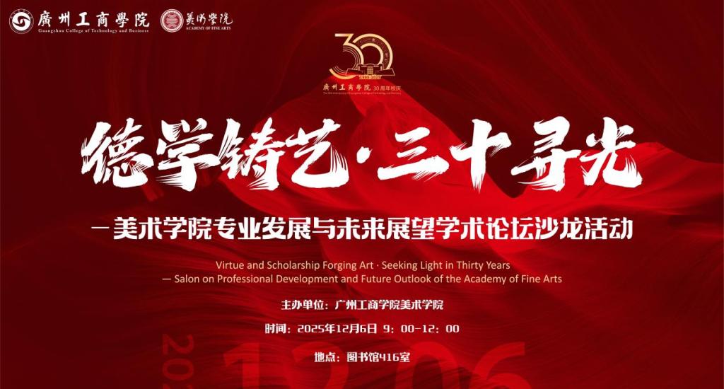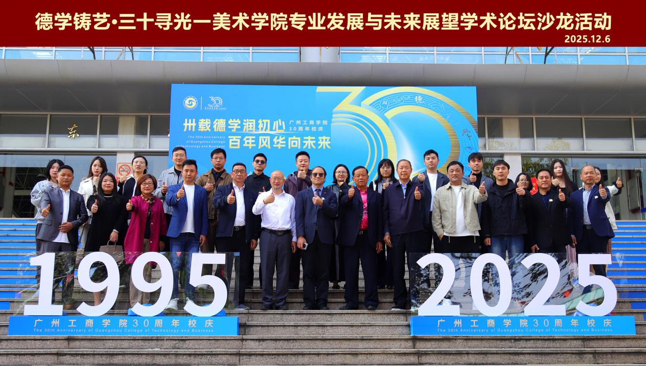 2025年12月6日,恰逢广州工商学院三十华诞,美术学院"德学铸艺·三十寻光"主题论坛在学校416报告厅隆重举行。论坛以学术交流为核心、以行业对接为纽带,汇聚了来自全国各地的校友代表、文创产业领军人物、兄弟院校专家学者及学院师生代表,共同围绕艺术学科发展、人才培养创新、产学研深度融合等关键议题展开研讨,以思想碰撞致敬办学初心,以专业对话擘画发展蓝图。