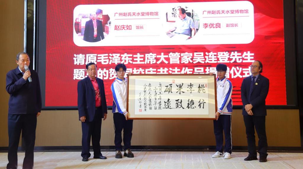 开幕式后,举行了隆重的校庆贺词书法作品捐赠仪式。广州赵氏天水堂博物馆馆长赵庆如代表博物馆,向学校捐赠了由原毛泽东主席大管家吴连登先生亲笔题写的校庆贺词书法作品。作品笔墨苍劲、意蕴深远,既承载着对广州工商学院三十华诞的美好祝愿,更彰显了中华优秀传统文化与现代高等教育的深度交融,为论坛增添了浓厚的文化底蕴,赢得现场阵阵掌声。