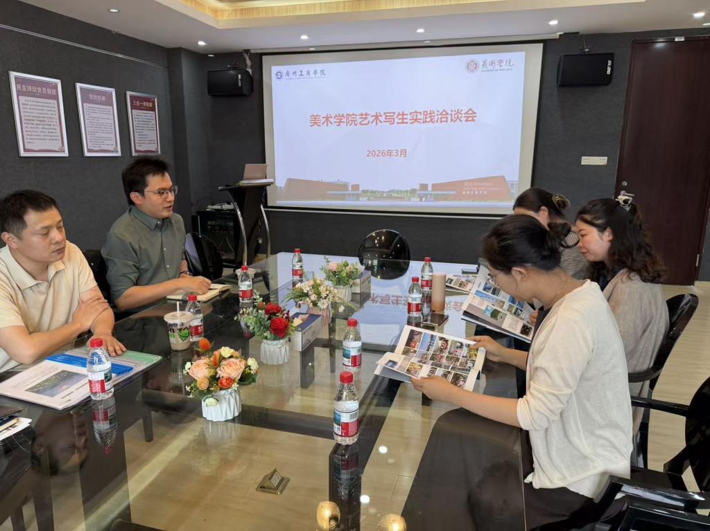 2026年3月19日,广州工商学院美术学院在学院201会议室,与广州盘古文化科技服务有限公司围绕艺术写生等事宜,召开深度洽谈会。会议由美术学院办公室主任程敏主持,盘古文化科技总经理黄深其携团队出席,美术学院环境设计专业教研室主任赵文瑾及艺术实践带队教师张鑫、陈扬参与座谈。