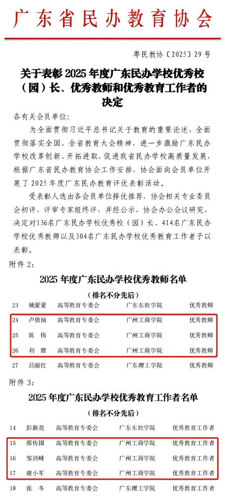 2025年9月15日,广东省民办教育协会2025年度优秀教师和优秀教育工作者评选结果正式揭晓。我校六位优秀教师凭借卓越业绩和突出贡献,在全省民办教育工作者中脱颖而出,斩获殊荣。卢倩楠、陈伟、利雅三位老师被授予“广东省民办学校优秀教师”称号;邢传国、邹剑峰、谢小军三位老师荣获“广东省民办学校优秀教育工作者”称号。