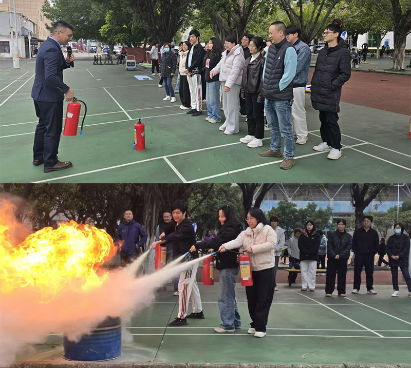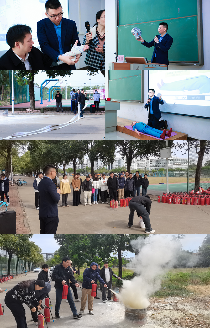 演练环节包括紧急疏散逃生、灭火器正确操作、消火栓使用流程、自救呼吸器佩戴及心肺复苏术(CPR)实操训练。通过模拟突发情境,师生进一步熟悉应急疏散路线,掌握基础救援技能,有效提升面对突发事件的应对能力和协同处置水平。