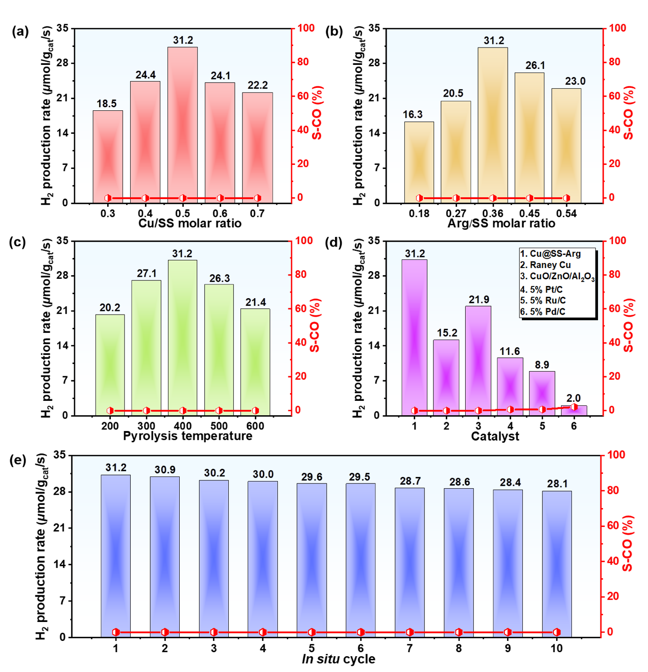 图2.不同条件下制备的Cu@SS-Arg催化剂在APRE中的催化性能:(a)不同Cu/SS摩尔比;(b)不同Arg/SS摩尔比;(c)不同热解温度。(d)Cu@SS-Arg催化剂与商业催化剂在APRE中产氢活性的比较。(e)Cu@SS-Arg催化剂在210 °C下的稳定性测试
