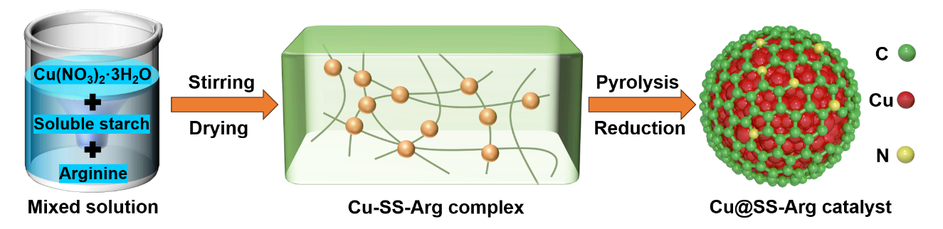 在全球积极推动碳中和的背景下,氢能作为零碳、高密度的二次能源,已成为能源转型的关键抓手。乙醇水相重整(APRE)可直接利用生物质乙醇制氢,兼具原料可再生、反应条件温和、产物易分离等优势,尤其适合分布式制氢场景。然而,开发低成本、高活性、高稳定性的非贵金属催化剂仍是该领域核心挑战。铜基催化剂虽成本低廉,但在无碱条件下普遍面临活性位点团聚、C–H/O-H键裂解效率低及CO副产等问题。近年来,生物质衍生的碳材料因其来源广泛、结构可调和限域效应,被广泛用于稳定金属纳米粒子。特别是可溶性淀粉(源自庄稼)和精氨酸(源自食品)等天然分子,不仅富含碳源,还含有丰富的含氮官能团,为制备氮掺杂碳包覆金属催化剂提供了理想前驱体。基于此,本研究利用可溶性淀粉作为碳骨架,精氨酸作为氮源和配体,通过溶胶-凝胶法制备氮掺杂碳包覆Cu催化剂,揭示生物质衍生碳层的限域效应与氮物种电子调控的协同机制,为开发可持续、高效率的APRE催化剂提供理论依据。