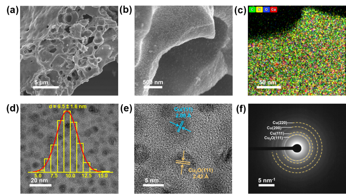 图1.(a - b)扫描电子显微镜(SEM)图像,(c)碳(C)+氮(N)+氧(O)+铜(Cu)的能谱图(EDS),(d)高分辨率透射电子显微镜(HRTEM)图像及相应的粒度统计,(e)晶面间距测量,以及(f)还原态Cu@SS-Arg催化剂的选区电子衍射(SAED)图像