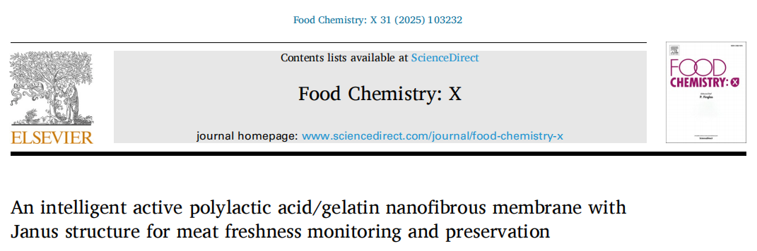 【本网讯】2025年,广州工商学院食品药品学院蓝兴梓老师在农林科学领域权威期刊《Food Chemistry: X》(IF = 8.2)发表研究论文,题为《An intelligent active polylactic acid/gelatin nanofibrous membrane with Janus structure for meat freshness monitoring and preservation》。