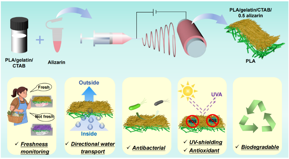 高蛋白肉制品在运输和储存过程中极易受到细菌污染并随之发生腐败变质。这不仅会造成大量的食品浪费和经济损失,还会对人体健康构成严重威胁。食品包装已成为延长食品保质期、进而减少浪费与安全风险的有效策略。然而,传统的石油基食品包装材料不可生物降解,缺乏生物活性,且无法进行实时新鲜度监测。因此,亟需开发可生物降解、智能且活性的食品包装,以确保食品质量与安全。本研究通过依次电纺疏水性聚乳酸纤维膜和亲水性聚乳酸/明胶/十六烷基三甲基溴化铵/茜素纤维膜,成功制备了一种集pH响应、抗菌、抗氧化、防紫外线和单向导湿特性于一体的多功能纤维膜,用于监测肉类新鲜度并延长其保质期。