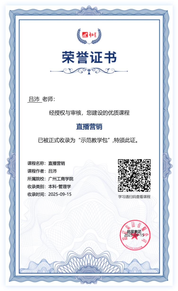近日,由商学院市场营销教研室吕沛老师负责建设的实验课程《直播营销》,经超星集团严格审核与授权,正式收录为本科-管理学“示范教学包”。