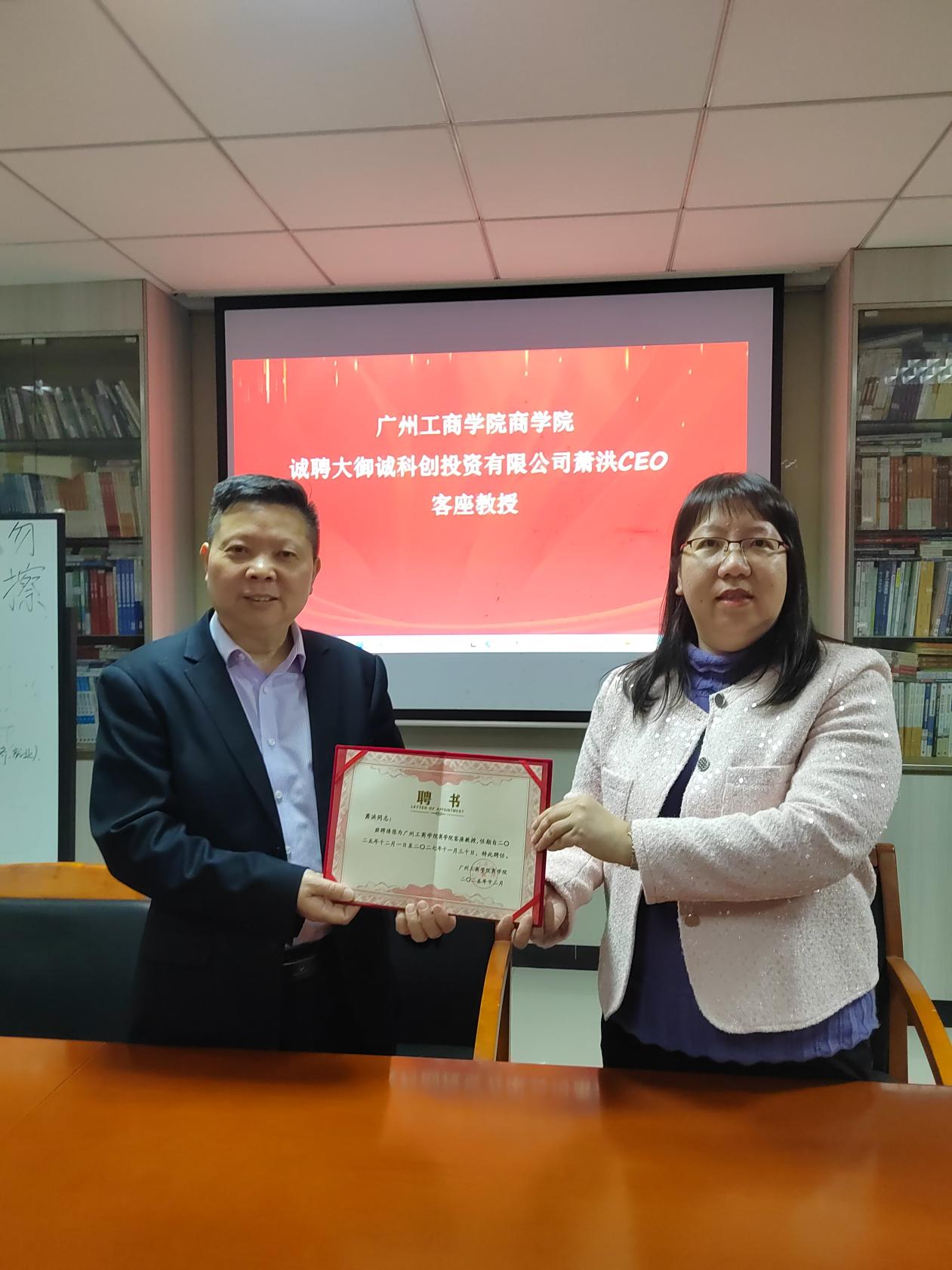 2025年12月4日下午,财务实战专家、大御诚科创投资(深圳)有限公司CEO萧洪正式受聘为广州工商学院商学院客座教授,并代表公司与学院签订投资学专业校外实践教学基地合作协议。商学院投资学专业主任谢桂珊副教授向萧洪颁发聘书,陈兰江副教授、夏晓晓讲师共同见证了签约仪式。