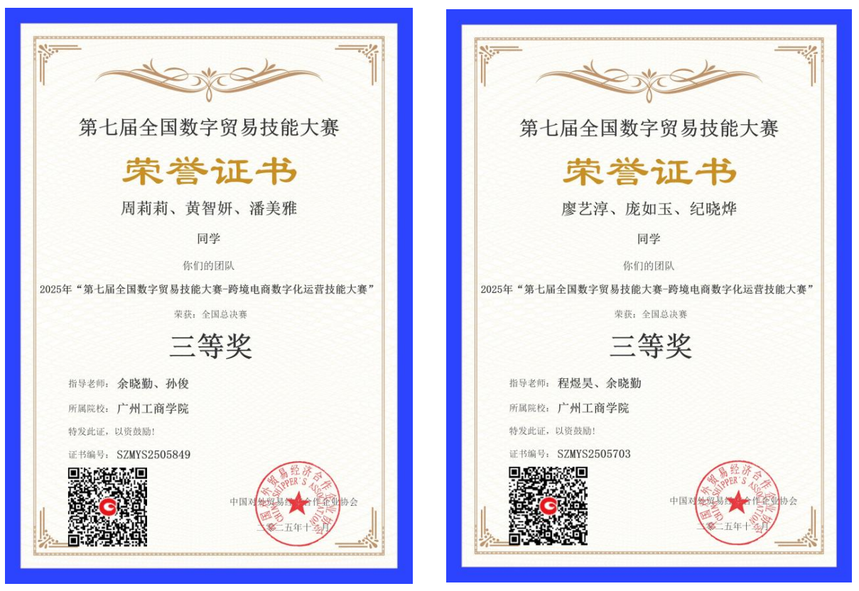 近日,第七届全国数字贸易技能大赛(跨境电商数字化运营技能大赛)全国总决赛圆满收官。广州工商学院商学院跨境电子商务专业组织学生团队参赛并取得优异成绩,在全国总决赛中共获得二等奖1项、三等奖2项,充分展现了学生在跨境电商数字化运营岗位能力与综合实践能力方面的良好水平。