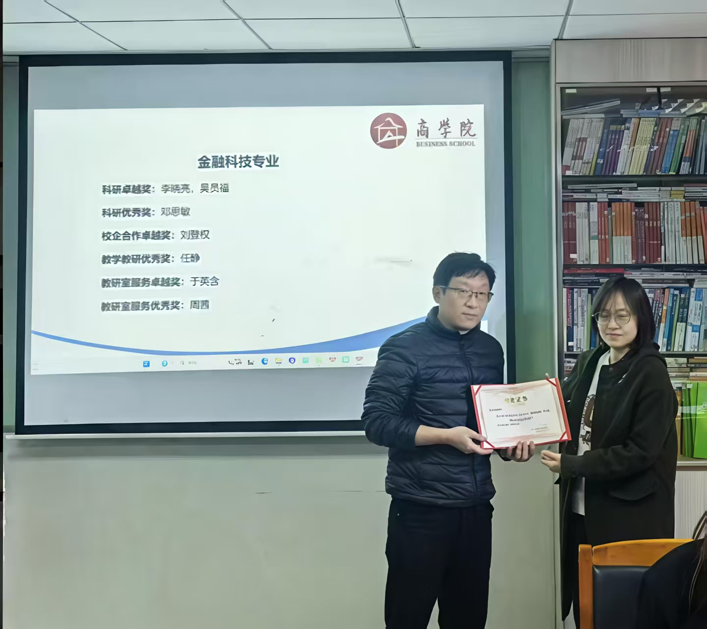 为表彰先进、树立榜样,大会举行了隆重的颁奖仪式。谢桂珊与程飞主任依次为获奖教师颁发荣誉证书。