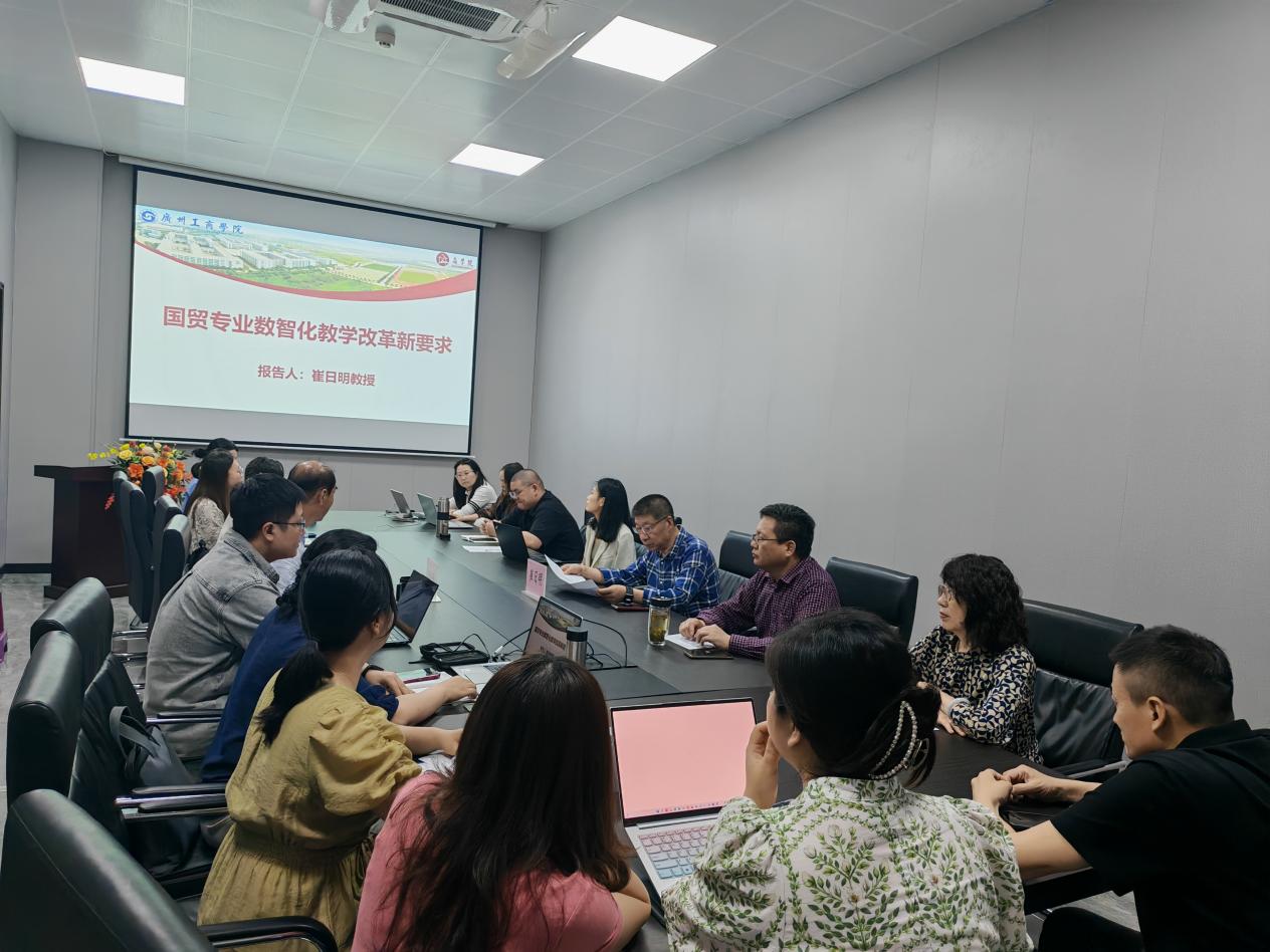 31日上午,崔日明教授针对国际经济与贸易专业教学数智化改革,与教研室骨干教师开展深度研讨。他结合课程性质与数智化教学趋势,对专业基础类、核心类、实验实训类及融合创新类课程的数智化改革路径进行分类指导,并明确了各类课程在教学平台的数智化建设具体任务。