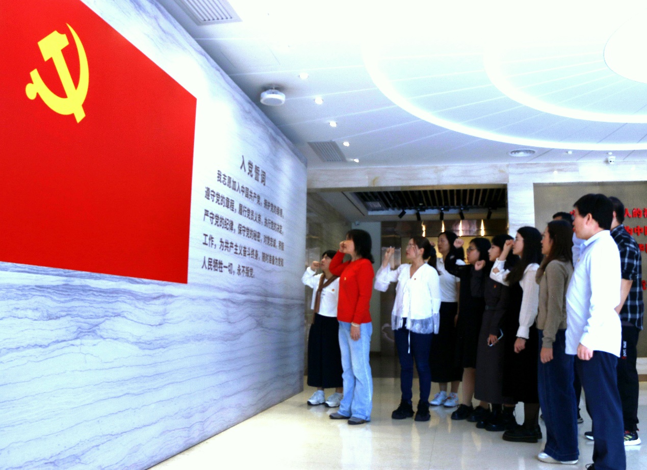 活动最后,在张艳霞同志的领誓下,市场营销教研室专业负责人谭晓丽教授以及教研室代主任陈丽副教授教工第一党支部全体党员面对鲜红的中国共产党党旗,庄严地举起右手,重温入党誓词。“我志愿加入中国共产党,拥护党的纲领,遵守党的章程……”铿锵有力的誓言在纪念馆内回荡,表达了支部党员们对党的无限忠诚以及为共产主义事业奋斗终身的坚定决心。市场营销教研室专业负责人谭晓丽教授以及教研室代主任陈丽副教授等也一同参加本次主题参观学习活动。