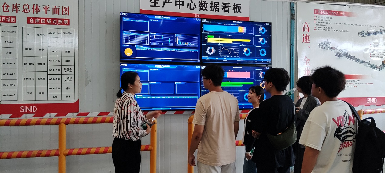 为进一步加深学生对数字化生产的理解,蓝智华导师带领师生走进数字化工厂进行实地参观。在生产中心数据看板前,她结合大屏上的数据图表与流程模块,详细讲解了工厂在生产调度、库存管理、效率监控等方面的数字化应用。师生们从仓库区域规划到高速自动化产线的运作逻辑,全面了解了数字化技术如何赋能工厂实现降本增效。