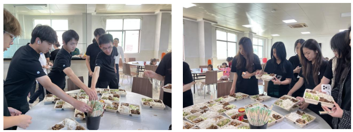 分享结束后进入午餐环节。学子们按年级顺序有序前往饭堂取餐,企业工作人员高效分工,贴心的餐食搭配与热情服务让大家吃得舒心,午后休息时光格外惬意。