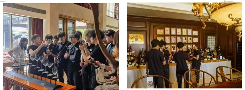 众人返回会议大厅,工作人员讲解酒杯设计原理与适配酒品。随后进入内侧会议室,全球各地酒品陈列其中,工作人员逐一介绍产地、工艺与风味。营销先锋团围在展柜旁,既认真记录酒品知识,又穿梭于学子之间,用镜头捕捉他们近距离观察、专注聆听的求知身影。