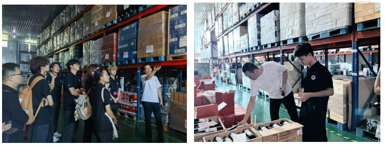 大家前往企业恒温仓库,货架高耸,酒品琳琅满目。工作人员讲解仓库管理与储备情况,学子们认真学习经验。市场营销协会成员聆听记录的同时,时刻关注学子们的动态,确保参观活动安全有序。