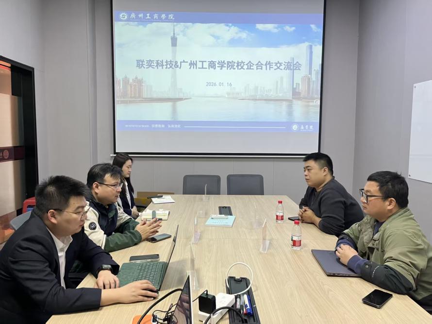 1月16日,为深入落实产教融合、校企协同育人政策,推动教育链、人才链与产业链、创新链深度衔接,近日,联奕科技股份有限公司许飞先生、沈伟豪先生一行到访广州工商学院商学院,与商学院电子商务专业负责人邓任锋、副主任梅思阳、副主任刘鑫、赖洁瑜教授及骨干教师李峰开展座谈交流,围绕产学研合作、校企共建实习基地、三创赛产教融合发展、微专业建设等核心议题深入洽谈,凝聚合作共识,共绘协同发展蓝图。