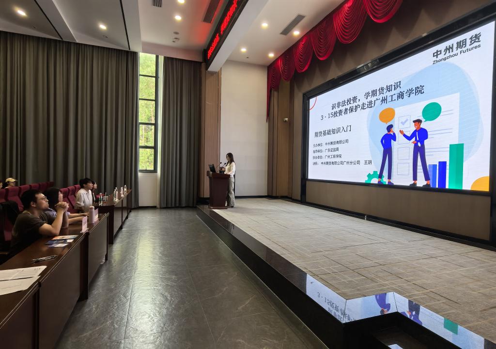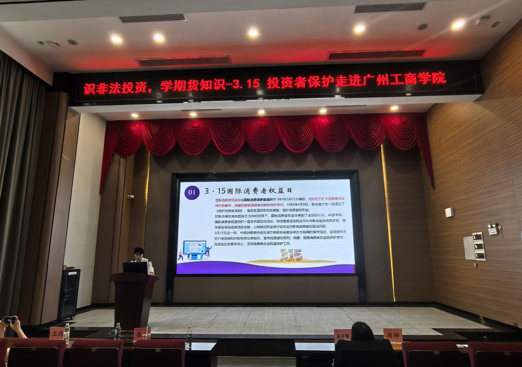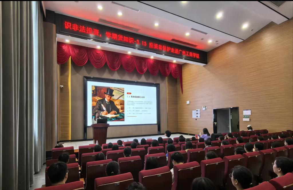 2026年3月18日下午,广州工商学院图书馆416会议室座无虚席,气氛热烈。由中州期货与广州工商学院商学院联合主办的“识非法投资,学期货知识——3.15投资者保护走进广州工商学院”专题讲座在此隆重举行,23级投资学B1、B2班以及25级投资学B1、B2班学生合计一百多人参加。本次活动旨在普及期货基础知识,提升大学生金融素养与风险防范意识,将投资者保护理念深植青年学子心中。