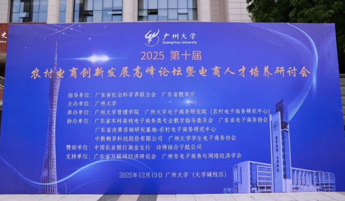 12月10日,由广东省社会科学界联合会、广东省教育厅指导,广州大学主办,广州大学管理学院、广州大学电子商务研究院(农村电子商务研究中心)承办,广东省电子商务协会等单位协办的“2025年第十届农村电商创新发展高峰论坛暨电商人才培养研讨会”在广州大学顺利举办。我院电子商务专业负责人邓任锋副教授受邀出席本次行业盛会,与各界专家共同探讨电商领域创新发展与人才培养新路径。