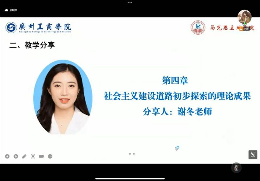 谢冬老师就第四章“社会主义建设道路初步探索的理论成果”进行了教学分享。她指出,受限于本章课时安排,教师在教学过程中应突出重点、聚焦关键理论问题。在具体教学设计上,谢老师对原有章节内容进行了重构,通过引入一系列新颖案例与历史素材,有效梳理了知识脉络,使理论呈现更加系统清晰。