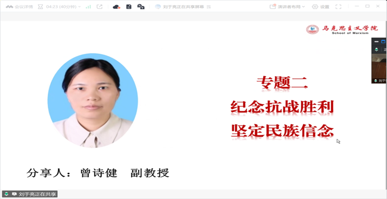 会议第一项议程,由曾诗健副教授就专题二“纪念抗战胜利 坚定民族信念”进行了系统性的教学指导与经验分享。她围绕“铭记历史”“意义彰显”“精神铸就”“未来愿景”四个主题构建了清晰的教学框架,引导教师对教材内容进行精准把握。在教学内容上,她通过巧妙融入时政热点、运用真实数据进行有力论证,穿插高质量的教学视频资源,构建起了既有历史厚重感又贴近学生认知特点的课堂教学,有效深化了学生对抗战历史的正确认识和对伟大抗战精神的深刻认同。此外,曾诗健副教授还结合自身丰富的教学实践,分享了宝贵的教学经验。她指出,教师在备课时应注重对教学内容的精当取舍,通过准确把握教学重点,辅以生动的案例支撑和深入的理论分析,使课堂教学层次更分明、内容更立体、启发性更强。