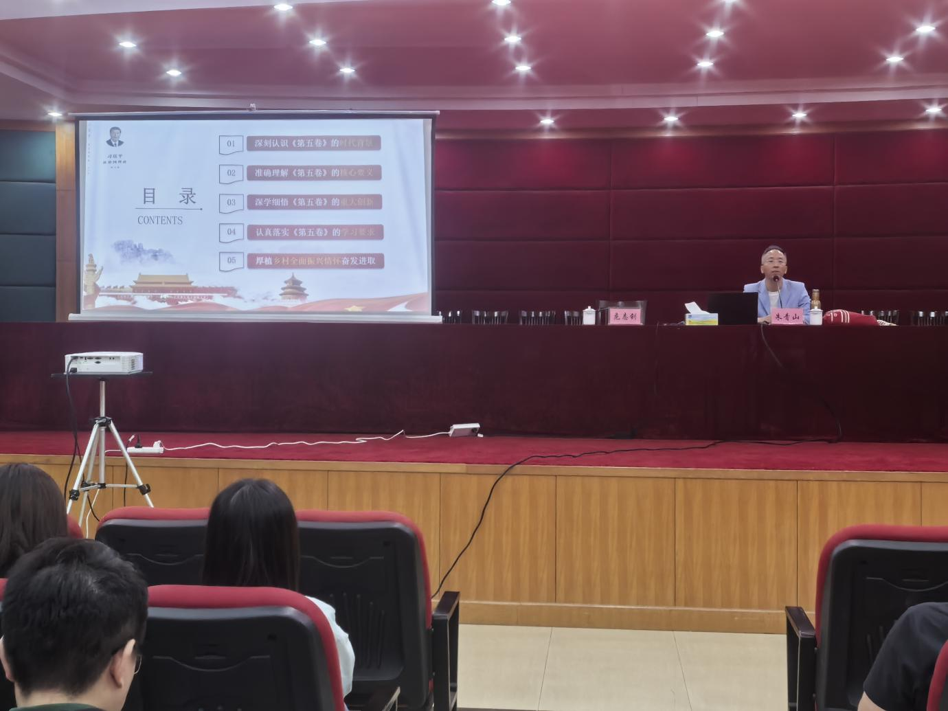 《习近平谈治国理政》第五卷是全面系统反映习近平新时代中国特色社会主义思想最新成果的权威著作,出版发行以来,在国内外引起强烈反响,学习宣传的热潮正在兴起。在此背景下,朱教授以《新思想领航复兴伟业 新征程践悟奋发进取》为题,主要讲授了时代背景、核心要义、重大创新、学习要求、奋发进取五个方面内容。