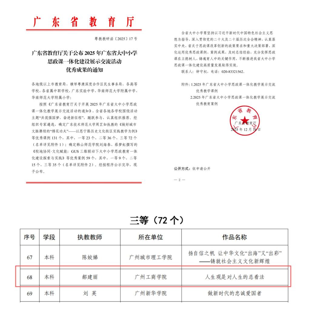 为全面展现新时代广东省大中小学思政课一体化建设的推进成效与典型经验,持续赋能全省思政课教育教学高质量发展,广东省教育厅组织开展了2025年广东省大中小学思政课一体化建设展示交流活动。近日,活动评选结果正式揭晓,我校马克思主义学院思想政治理论课实践教学课程教研室主任郝建丽老师的参赛作品《人生观是对人生的总看法》脱颖而出,荣获本科组三等奖。