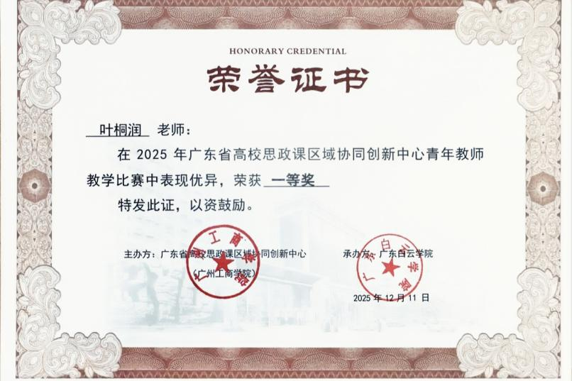 近日,由广东省高校思政课区域协同创新中心(广州工商学院)主办、广东白云学院承办的“2025年广东省高校思政课区域协同创新中心青年教师教学比赛”在广东白云学院圆满落幕。我校马克思主义学院教师叶桐润凭借扎实的教学基本功和出色的现场表现,在众多参赛选手中脱颖而出,荣获一等奖。