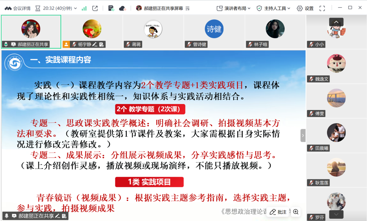 为深入贯彻落实习近平总书记“‘大思政课’我们要善用之”的重要指示精神,进一步深化高校“大思政课”建设,构建理论与实践深度融合的育人新格局,3月24日晚,马克思主义学院思想政治理论课实践教学教研室在线上召开了2026年春季学期《思想政治理论课实践教学(一)》第一次集体备课会。会议由教研室主任郝建丽主持,全体任课教师参会。
