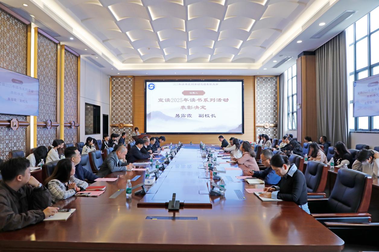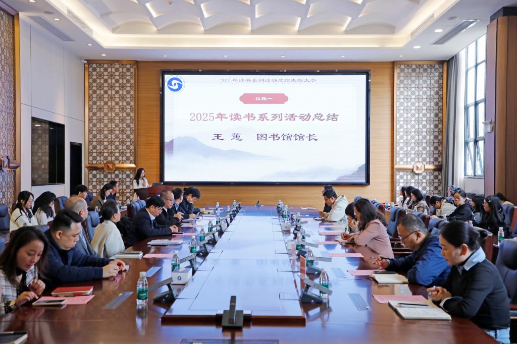 王蕙馆长对2025年读书系列活动作总结发言。她对2025年的读书系列活动作了系统介绍,系列活动从3月份策划、启动到12月结束,系列活动覆盖全校师生,开展学术讲座、知识竞赛、信息素养竞赛、读书分享、创作比赛等25项各类读书活动,累计参与人次达到8454人次;组织全校学生参与多项校外读书活动,校外赛事获得各级奖项达36人次,较上年度有显著的提升;同时,图书馆的图书借阅总量和生均借阅量也均有相应的提升。今后图书馆将以此次活动为契机,总结经验、弥补不足,进一步深化阅读推广与人才培养、专业建设、产业服务的深度融合,为培养更多“德学兼备、知行合一,扎根南粤、服务湾区”的新时代优秀应用型人才贡献力量。