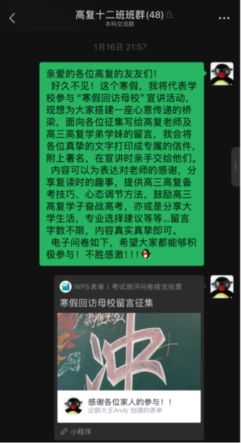 在母校班群、个人朋友圈开展“回访母校留言征集”活动,收集往届学子对老师、高三学子的留言并整理成信;制作学生信息登记表,便于后续招生沟通。