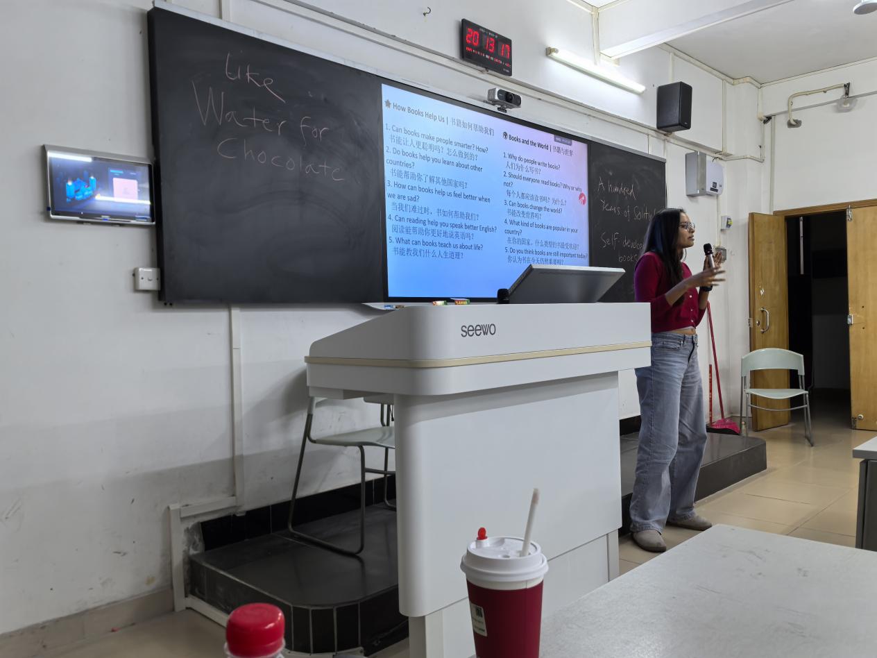 活动伊始,外教老师以泰勒·斯威夫特的歌曲《Ophelia》为引,生动介绍了莎士比亚经典剧作《哈姆雷特》中奥菲利娅这一经典文学形象,引发了同学们对文学作品的浓厚兴趣。在随后的讨论环节,同学们围绕"个人阅读体验"、"书籍如何帮助我们"以及"书籍与世界"三大主题展开深入交流。大家积极分享自己最喜爱的书籍,探讨阅读对英语学习的帮助,畅谈书籍对个人成长的影响,现场气氛温馨而热烈。