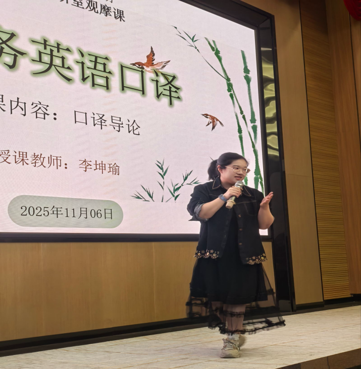 本次示范课由商务英语教研室李坤瑜老师主讲,授课内容为《商务英语口译》Training Course 1 —— Building Interpreting Skills Step by Step。李老师以生动活泼的教学设计和扎实的专业功底,为现场教师与学生带来了一堂内容充实、启发性强的示范课。