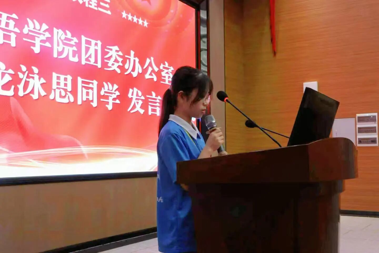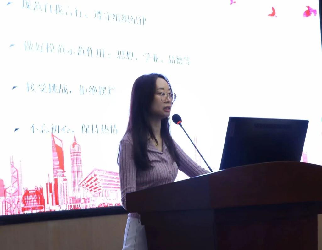 外语学院团委办公室龙泳思同学进行发言,她向大家介绍从干事到干部的转变并不是身份的转变而是责任的加码,分享了在团学中的经验和技巧,她表示希望可以和干事们一起书写属于我们的团学精彩。