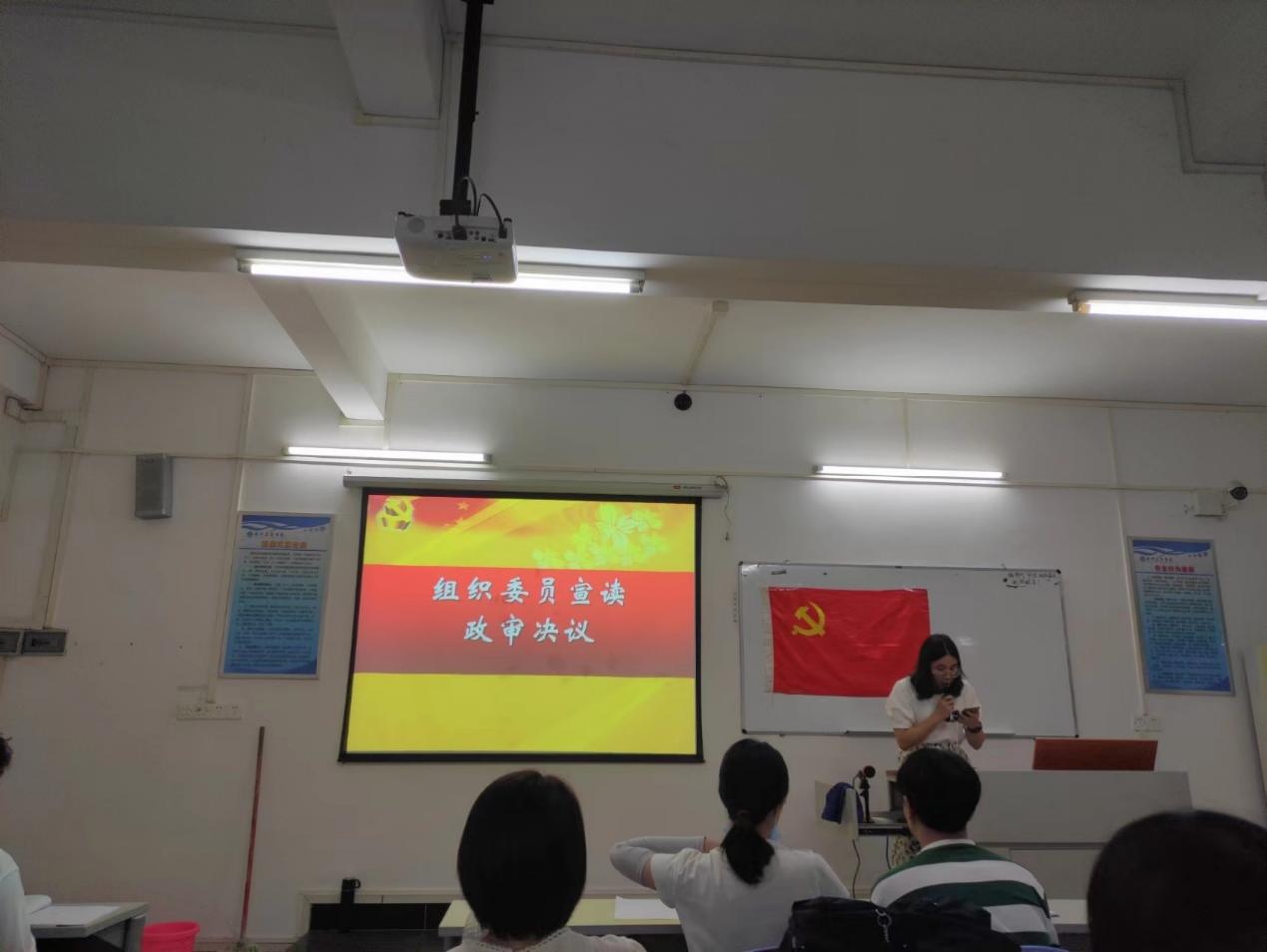 汇报完毕后,由入党介绍人根据这2名发展对象一年来的培养和联系,说明介绍理由和考察情况,肯定了她们已基本具备预备党员的条件,同意2名发展对象按期转为中共预备党员。然后,由支部组织委员覃青霞同志宣读对发展对象的政审决议,综合他们各方面的表现,党组织同意接收曾海珊同志和姚真真同志为中共预备党员。