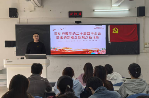 会议第一议程:进行第一议题学习。党支部书记毕玉祥同志带领支部成员一起学习《深刻把握党的二十届四中全会提出的新概念新观点新论断》。毕书记结合“夯实基础、全面发力”核心要求与党的二十届四中全会精神,以“理论筑基 + 专业强能 + 实践聚力”为框架,通过“双基夯实、多维发力、成果转化”三部分,展现外语学子以专业赋能中国式现代化的实践,凸显基础筑牢与全面突破的协同效应。