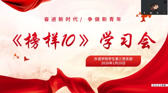 为深入学习贯彻习近平新时代中国特色社会主义思想,落实中央组织部关于学习收看《榜样10》专题节目的工作要求,充分发挥先进典型的示范引领作用,引导师生党员筑牢信仰之基、汲取奋进力量,2026年1月20日晚,外语学院学生第三党支部组织师生党员线上集中观看《榜样10》专题节目,此次学习会议由罗媛同学主持。