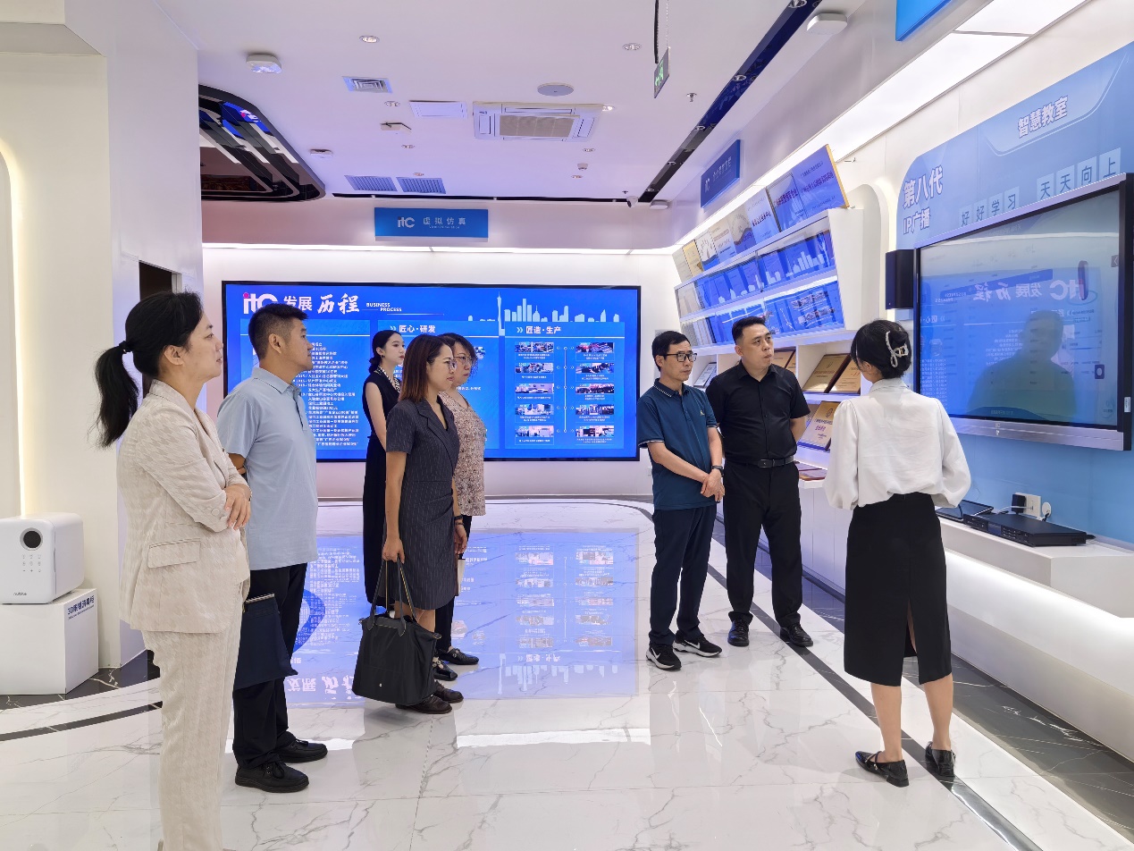 调研团队首先参观保伦电子智慧体验馆,实地观摩公司研发的声、光、电、视、讯系统。外语学院2024届商务英语专业毕业生张倩怡担任讲解员,详细介绍了企业在智慧政务、智慧教育、智慧校园、数字会议、数字化扩声系统、沉浸式演出平台等领域的技术优势与市场布局。